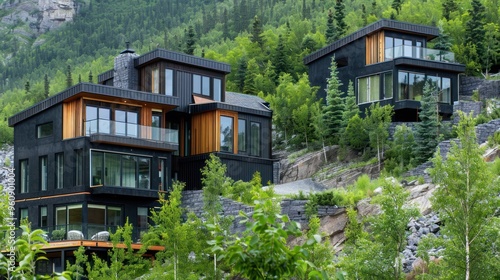 house, architecture, modern, home, building, mountain, hill, forest, tree, mountainside, contemporary, design, exterior, landscape, residential, property, green, wood, glasses, balcony, window, black, stone, roof, nature, structure, estate, view, luxury, elevated, serene, peaceful, minimalist, rustic, greenery, sky, natural, outdoors, real