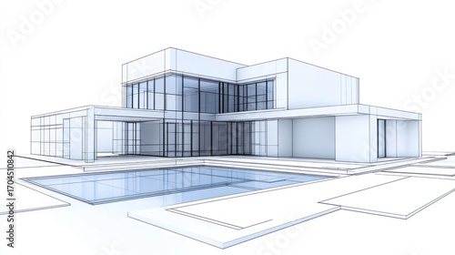 architecture, blueprint, building, contemporary, design, drawing, geometric, home, house, illustration, line, minimal, minimalism, modern, outline, perspective, plan, pool, property, real estate, residential, scheme, vignetting, structure, style, swimming pool, technical, vector, villa, white, wireframe, three-dimensional, computer graphic, draft, elevation, exterior, graphic, layout, model, render, rendering, visualisation, blue, clear, empty, light, simple, space