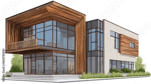 Modern House Design Illustration with Wood and Glass Facade Elements
