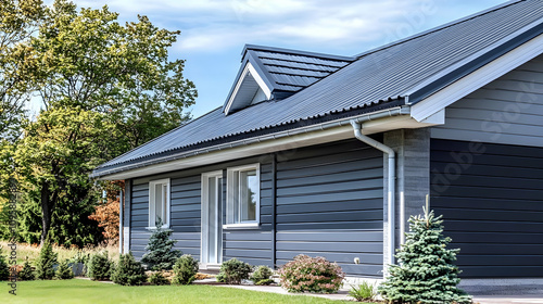 Modern House Exterior with Gray Siding and Metal Roof - Realistic Image