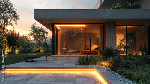 Modern house exterior with illuminated patio and garden at sunset, featuring sleek design and eco friendly elements. warm lighting creates cozy atmosphere