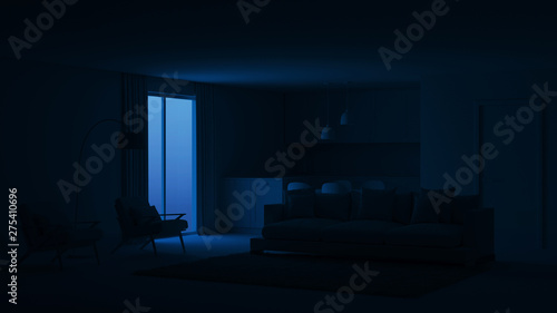 Modern house interior. Night. Evening lighting. 3D rendering.
