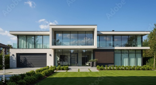 house, architecture, modern, building, exterior, home, residence, design, facades, window, glasses, lawn, grass, yard, sky, blue, white, contemporary, property, real estate, residential, structure, garden, landscaping, tree, sunlight, outdoors, daylight, clean, geometric, symmetry, entrance, driveway, garage, bush