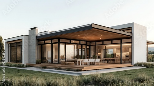 Modern house with large windows, open layout, and a green landscape, ideal for showcasing contemporary architecture.