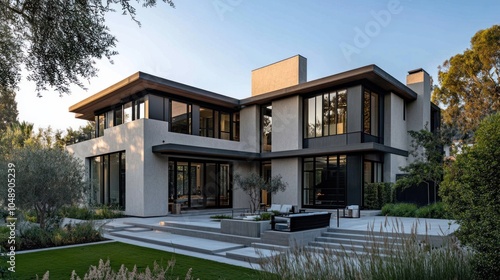 house, modern, architecture, home, patio, landscape, garden, lawn, grass, tree, shrub, bush, plant, stone, concrete, step, stair, paseo, path, furniture, couch, chair, table, window, glasses, wall, siding, roof, sky, blue, evening, sunset, sunlight, shadow, exterior, design, residential, property, backyard, greenery, green, brown, grey, black, white