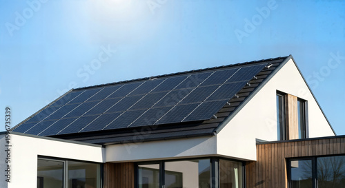 Modern House with Solar Panels on Roof, Sustainable Energy, Green Living, Blue Sky