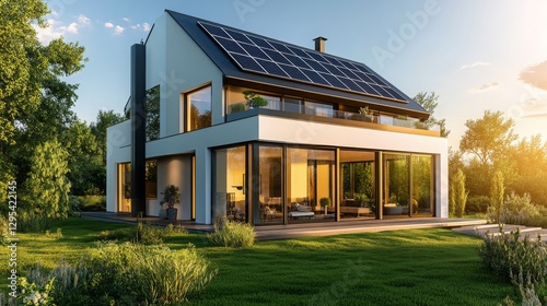 Modern house with solar panels surrounded by greenery at sunset showcasing sustainable living
