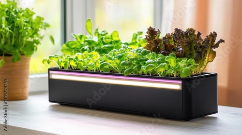 Modern indoor garden featuring vibrant lettuce and herbs under LED light by a sunny window