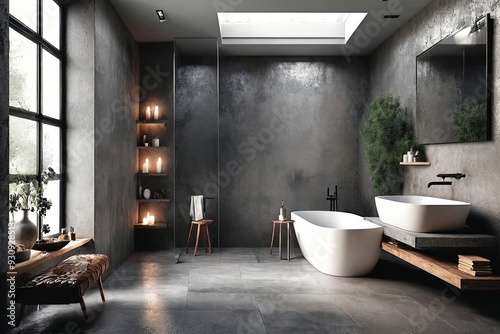 bathroom, industrial design, bathtub, sink, shower, candle, plant, window, bench, book, towel, faucet, mirror, ceiling light, interior, bathe, home, house, design, luxury, room, architecture, tile, privies, indoor, tile, clean, contemporary, new, floor, nobody, light, hotel