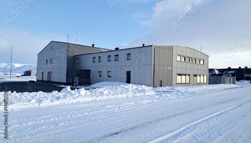 Modern Industrial Building Surrounded by Snowy Landscape in Winter