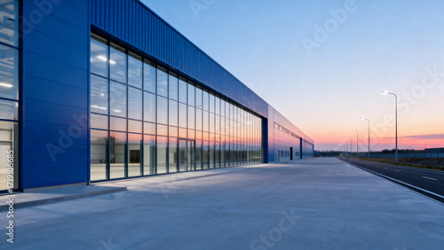 industrial building, dusk, modern architecture, warehouse, street light, evening sky, sunset, clear sky, urban development