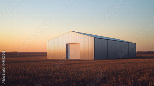 Modern Industrial Elegance: A contemporary metal structure stands prominently in an open field under a gradient sky, embodying a sense of vastness and serene stillness.