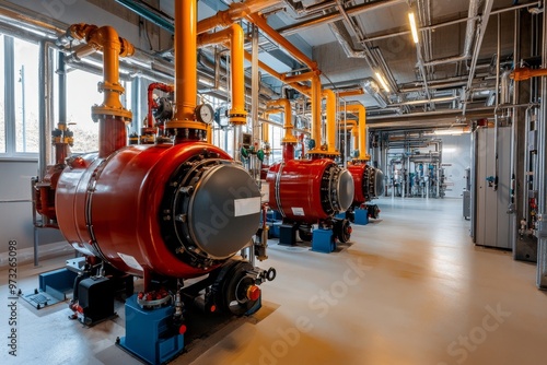 Modern industrial gas boiler room with heating system, showcasing large red boilers, yellow pipes, and a clean industrial aesthetic.