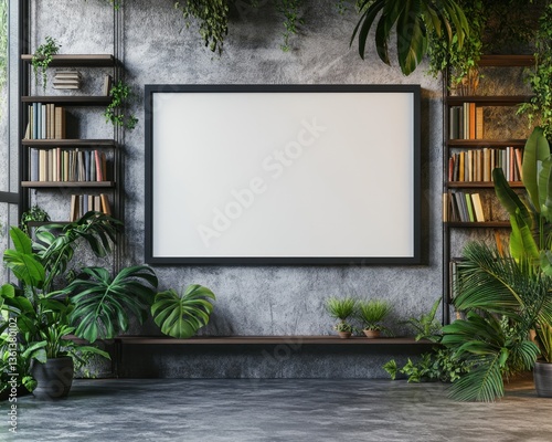 frame, blank, interior, design, industrial, modern, greenery, plant, bookshelf, concrete, loft, apartment, room, botanical, foliage, home decor, template, presentation, showcase, artwork, display, image, photo, picture, background, texture, style, trendy, stylish, space, living room, office, home