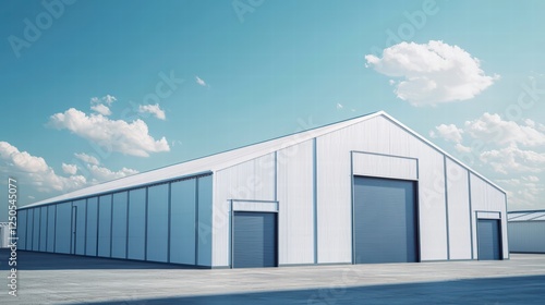 Modern Industrial Warehouse: A sleek, expansive warehouse building stands against a clear blue sky, showcasing its modern design and large industrial doors.