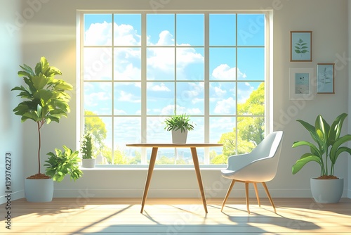 interior, design, home, window, nature, light, plant, table, chair, modern, furniture, decor, bright, workspace, relaxation, minimalism, sunny, cosy, atmosphere, vector, indoor, garden, living room, artwork, greenery, comfortable, mood, home office, contemporary, breeze, view, outdoors, balance, serene, style, colourful, scenic, sunlight, pot plant, interior design, minimalistic, calmness, warmth, elegance