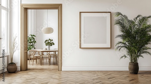 Modern interior, light tones, white walls with a wooden floor, a large picture frame hanging on the wall in front of an open door leading to the dining room.