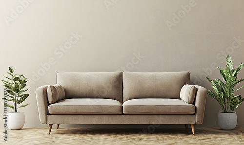 Modern Interior Minimalist Living Room with Wooden Flooring and Sunlit Space 3D Rendering