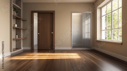 room, interior, floor, wood, door, window, sliding, modern, home, design, empty, wall, indoor, minimalist, parquet, shelf, plant, clean, light, hardwood, residential, apartment, contemporary, style, architecture, furniture, housing, property, real estate, rendering, shower, glasses, sunlight, daytime, window frame, bright, shadow, domestic, home improvement, living space
