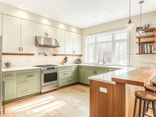 kitchen, modern, design, cabinet, green, island, countertop, white, tile, wood, flooring, stainless, steel, appliance, range, oven, hood, sink, faucet, window, light, lighting, pendant, light, shelf, book, decor, style, home, interior, room, farmhouse, chic, minimalist, elegant, space, breakfast, bar, stool, wooden