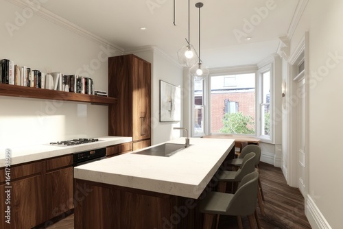 kitchen, interior, modern, design, roomy, sunlit, wood, cabinetry, counter, island, window, light, furniture, contemporary, bright, clean, minimalist, apartment, home, space, open, view, white, grey, warm, natural, rendering, realistic, digital, three-dimensional, comfortable, style, marble, dining, family, practical, elegant, simple, functional, charming, new, beautiful