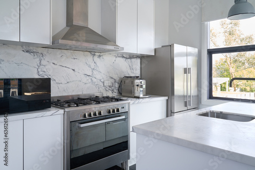 Modern kitchen interior with marble bench tops