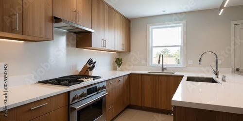 Modern kitchen interior, wood cabinets, white countertops, stainless steel appliances, minimalist design, natural light, window view, clean lines, neutral color palette, spacious layout, undermount si
