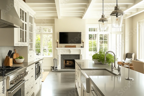 Modern Kitchen Island Design: Sunlit Luxury Kitchen with Marble Island, Stainless Steel Appliances, and White Cabinets Spacious Kitchen and Living Room in New Contemporary Style Luxury Home