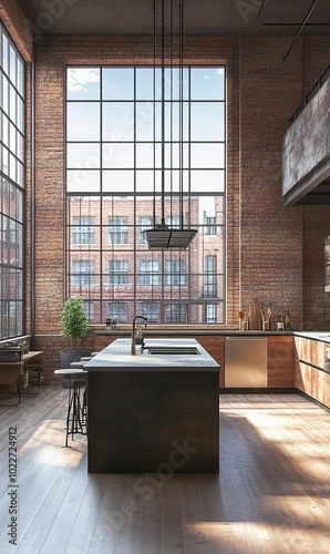 modern, kitchen, island, industrial, loft, brick, interior, design, minimalist, farmhouse, rustic, contemporary, open, window, city, large, countertop, faucet, sink, wood, floor, natural, light, stainless, steel, cabinet, brown, white, grey, shadow