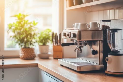 kitchen, hot drink, plant, sunlight, countertop, kitchen utensile, home appliances, beverage, preparation, interior, aesthetic, design, decor, stainless steel, natural light, cosy, warmth, brewing, morning, technology, lifestyle, freshness, culinary, workspace, clean, minimalist, arrangement, home, comfort, bright, greenery, pot, relaxing, modern, simplicity, healthy, energy, equipment, workshop, jar, blender, utensil, ambience, harmony, enjoyment