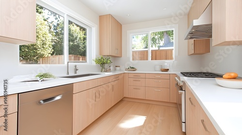 kitchen, modern, light, wood, cabinetry, quartz, countertop, stainless, steel, appliance, bright, airy, natural, window, roomy, clean, minimalist, contemporary, design, home, interior, decor, style, elegant, sophisticated, luxury, calm, serene, peaceful, inviting, comfortable, functional, efficient, organised, neat, tidy, beautiful, stunning, impressive, immaculate, pristine, renovated, new, fresh, sunny, warm, welcoming