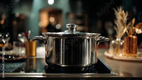 Modern kitchen with stainless steel pot on electric stovetop and stylish decor in soft lighting