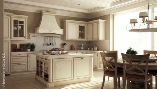 Modern Kitchen with White Cabinets, Island, and Barstools, Well-Lit by Pendant Lights