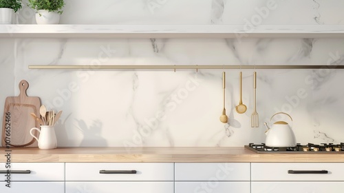 Modern kitchen with wooden shelves, plants, jars, and utensils. Bright , organized, and cozy with natural light and stylish decor.