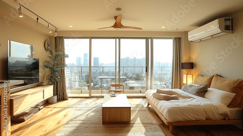 apartment, korean, studio, modern, interior, city, view, bedchamber, furniture, wooden, home, decor, urban, living, space, contemporary, design, window, sunlight, cosy, bed, panoramic, skyline, minimalist, comfort, luxury, style, elegant, architecture, residential, lifestyle, trendy, television, plant, natural, lighting, simplicity, floor, glasses, air-conditioner, comfortable, stylish, bright, roomy, clean, real estate, city life
