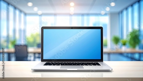 Modern laptop computer sits on a desk in a bright, blurred office environment.