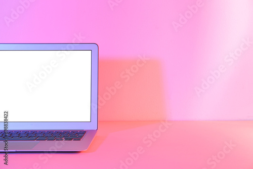 Modern laptop on pink background