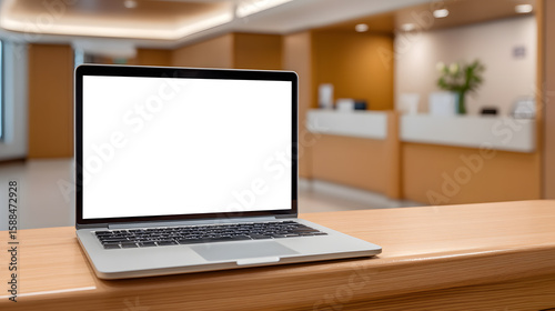 Modern laptop with blank white screen placed on hospital reception counter. Ideal for medical app mockups, healthcare UI, or telemedicine visuals. Clean and professional setting.