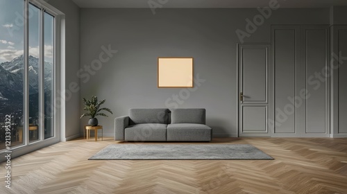 modern, living room, interior, design, contemporary, apartment, home, house, grey, sofa, couch, furniture, hardwood, floor, herringbone, wood, mountain, view, window, landscape, minimalist, chic, elegant, stylish, room, space, decor, art, frame, wall, plant