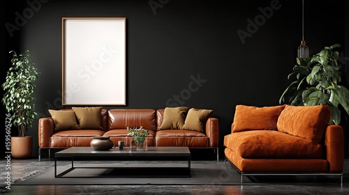 stylish, dark, velvet, frame, interior, textured, space, living, poster, sofa, contemporary, lighting, leather, brown, minimalist, orange, comfortable, empty, cosy, darkroom, black, mock, neutral, furniture, home, room, table, plant, display, mock-up, modern, potted, hot drink, art, decor, design