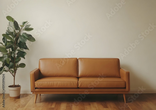 Modern living room interior with wooden floor, light brown leather sofa, and a decorative plant on a white wall background.