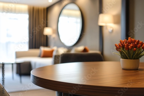 family room, table, wooden, orange, pot, decor, design, sofa, light, round, look, neat, relax, fashionable, environment