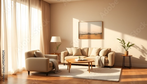 Modern Living Room with Beige Sofa, Coffee Table, and Natural Light