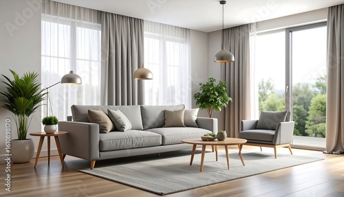 modern, living, room, sofa, grey, wooden, hot drink, table, window, view, scenic, light, airy, roomy, plant, neutral, calm, serene, elegant, minimalist, contemporary