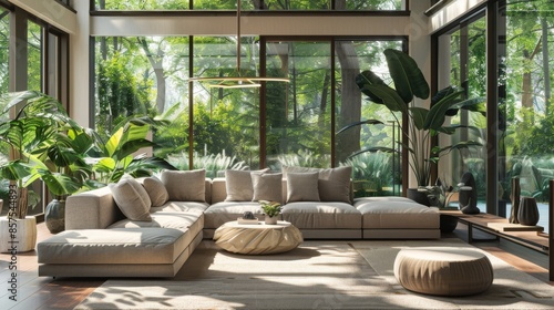 Modern living room with large windows and indoor plants, contemporary interior design concept