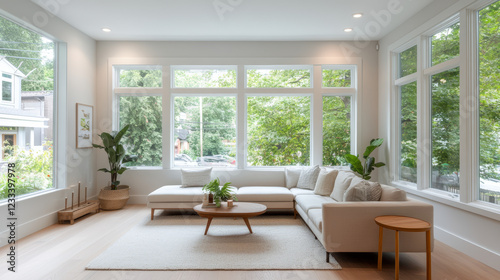 Modern living room with large windows, natural light, and plants