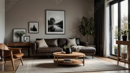 room, living, modern, interior, home, design, decor, apartment, furniture, sofa, leather, couch, hot drink, table, wooden, window, large, plant, plant, neutral, grey, beige, rug, carpet, style, contemporary, minimalist, chic, elegant, comfort, cosy, space, relaxing, calm, serene, light, natural, art, picture, frame, wall, aesthetic, ambience, homelike, sophisticated, stylish, house, dwelling