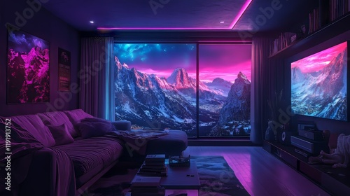 Modern living room with mountain view and vibrant neon lighting at dusk.