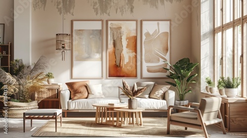 living, room, interior, design, decor, home, furniture, couch, sofa, chair, armchair, table, hot drink, plant, potted, rug, window, natural, light, sunlight, wall, art, artwork, abstract, minimalist, modern, contemporary, style, neutral, warm, colours, earthy, tone, chic, bohemian, cosy, comfortable, stylish, elegant, relaxing, bright, airy, roomy, house