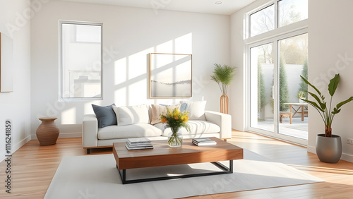 Modern living room with natural light, minimalist sofa, wooden coffee table with flowers, abstrac